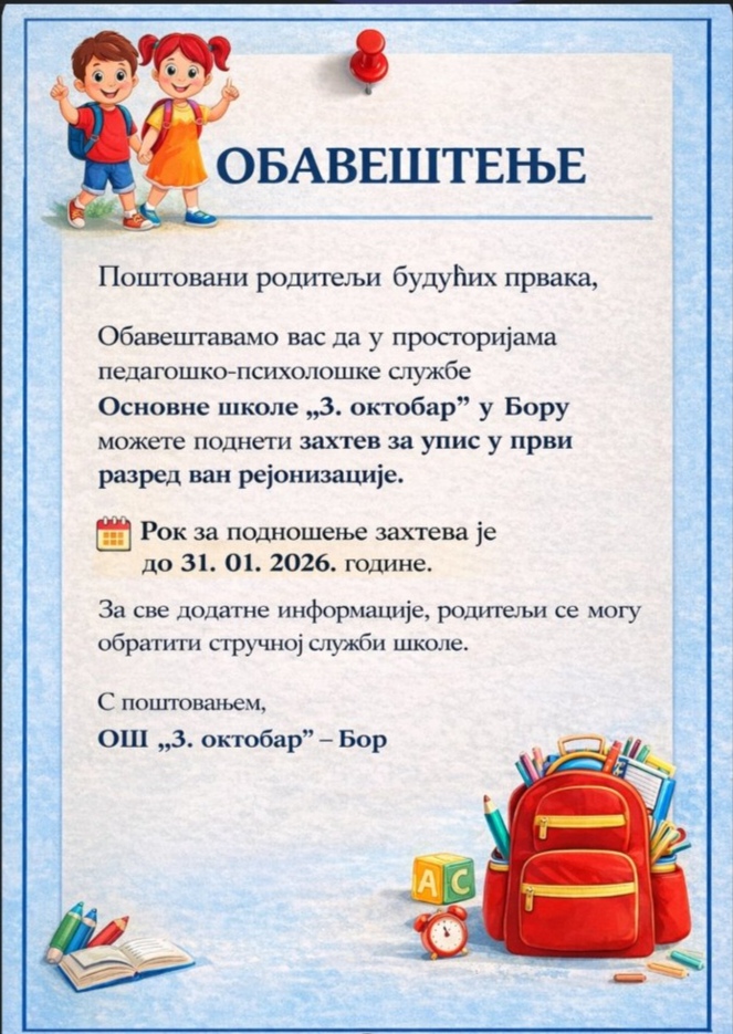 Упис првака ван рејонизацијеДатум: 12. Januar 2026 08:06 Категорија: Новости