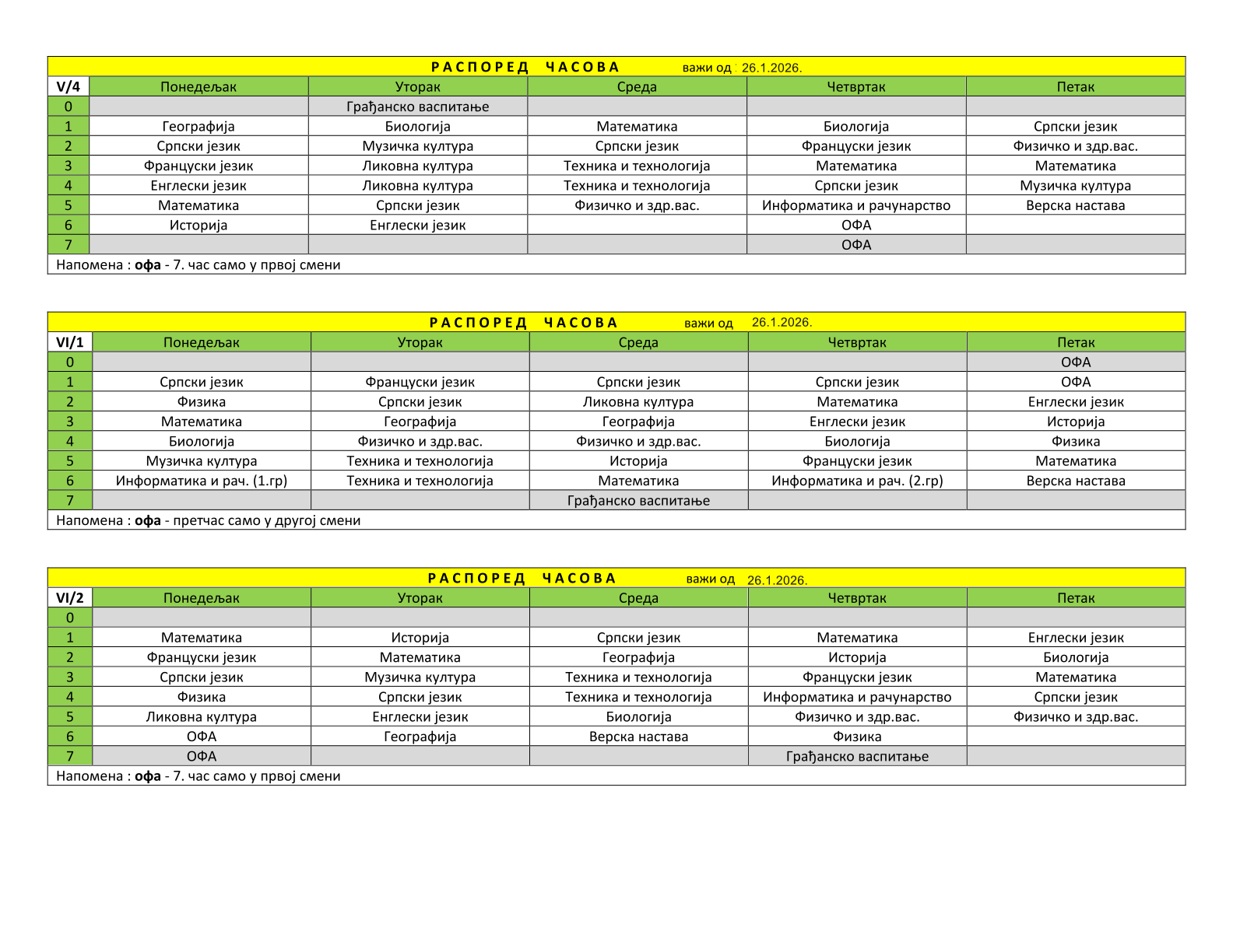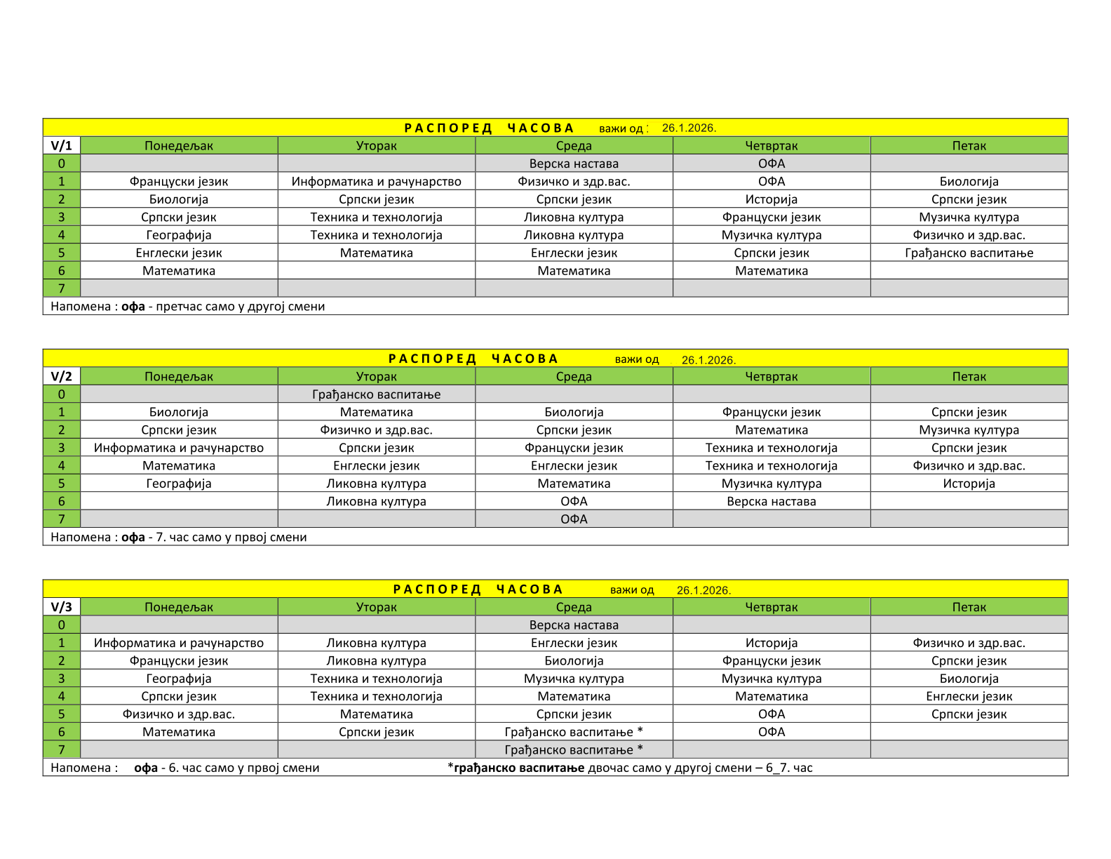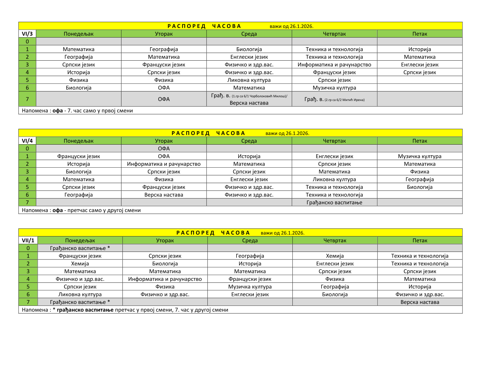 Распоред часова за други циклус Распоред слободних наставних активности Распоред часова за први циклус