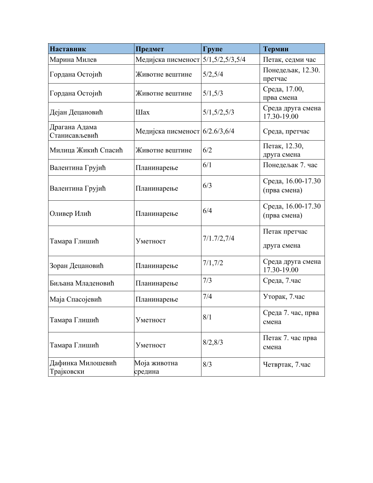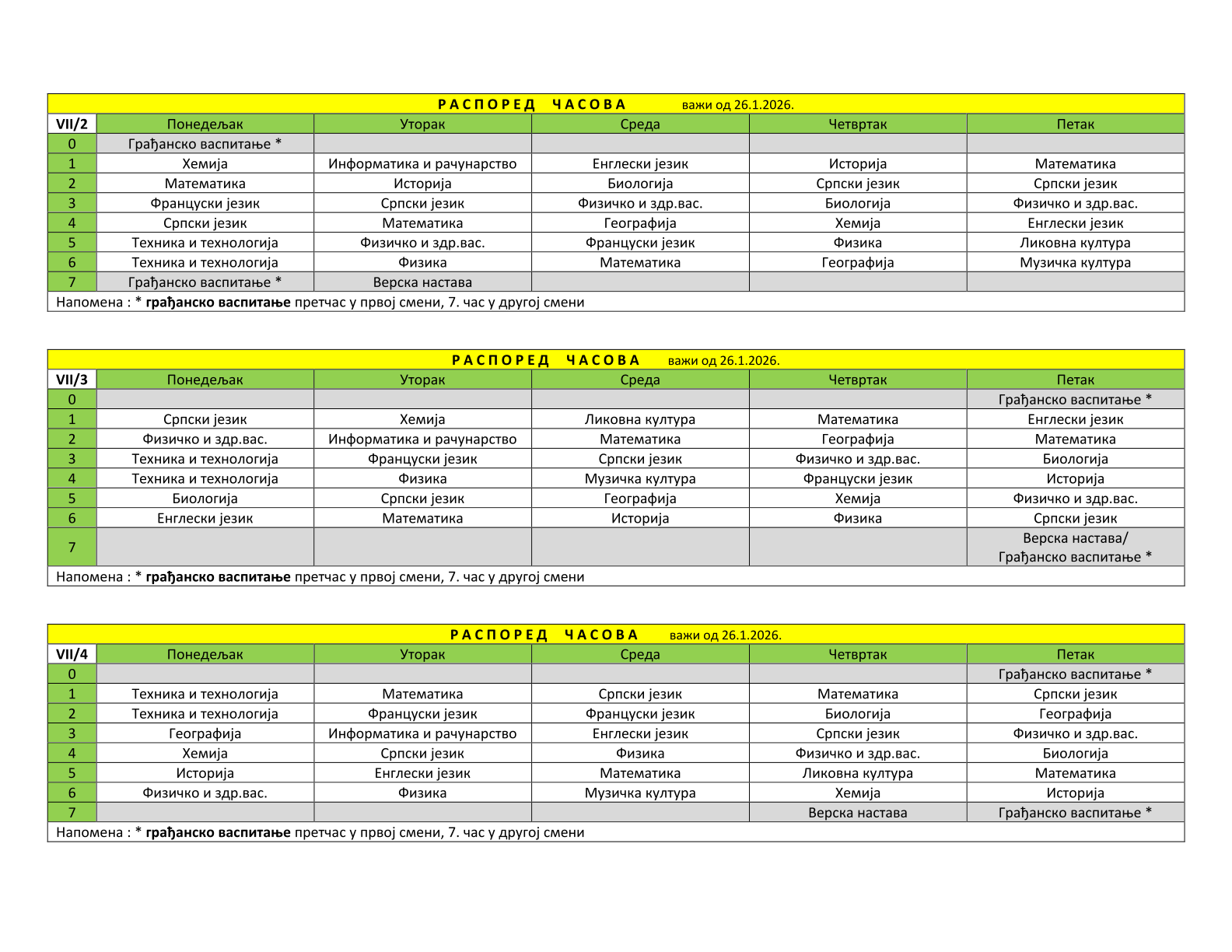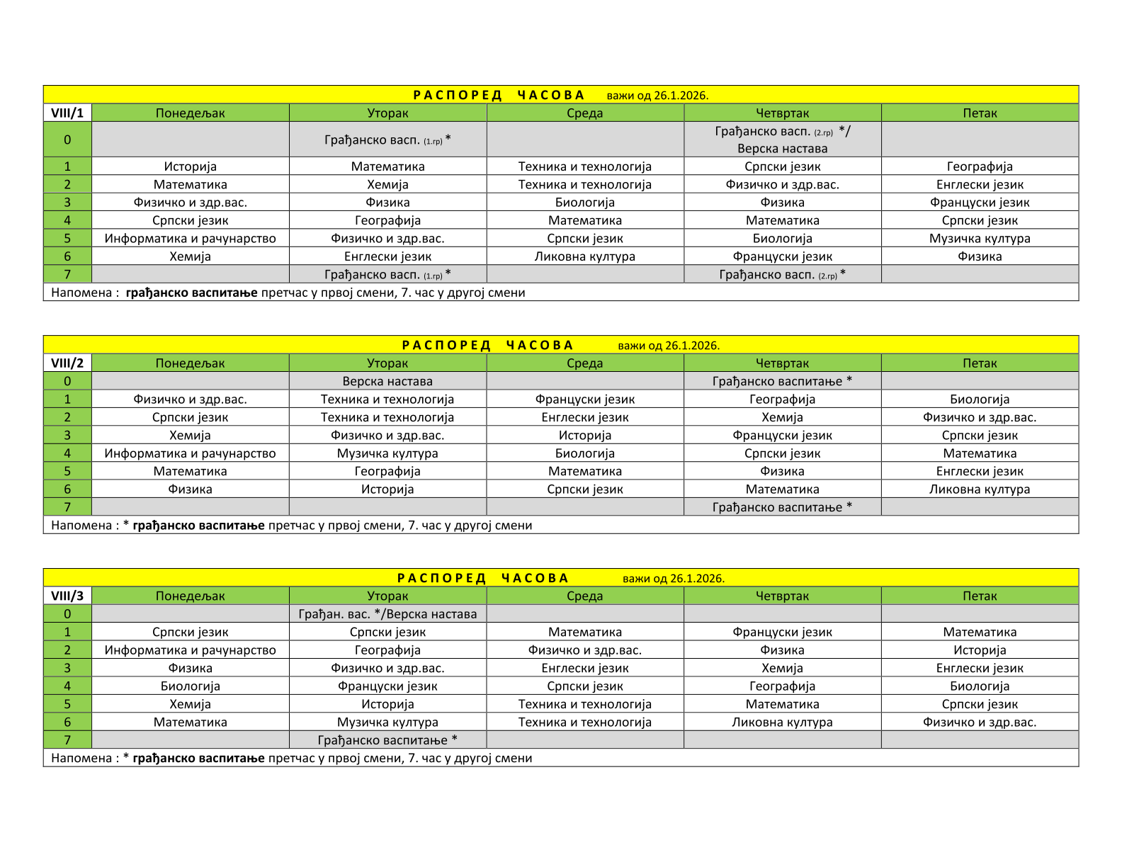 Распоред часова за други циклус Распоред слободних наставних активности Распоред часова за први циклус