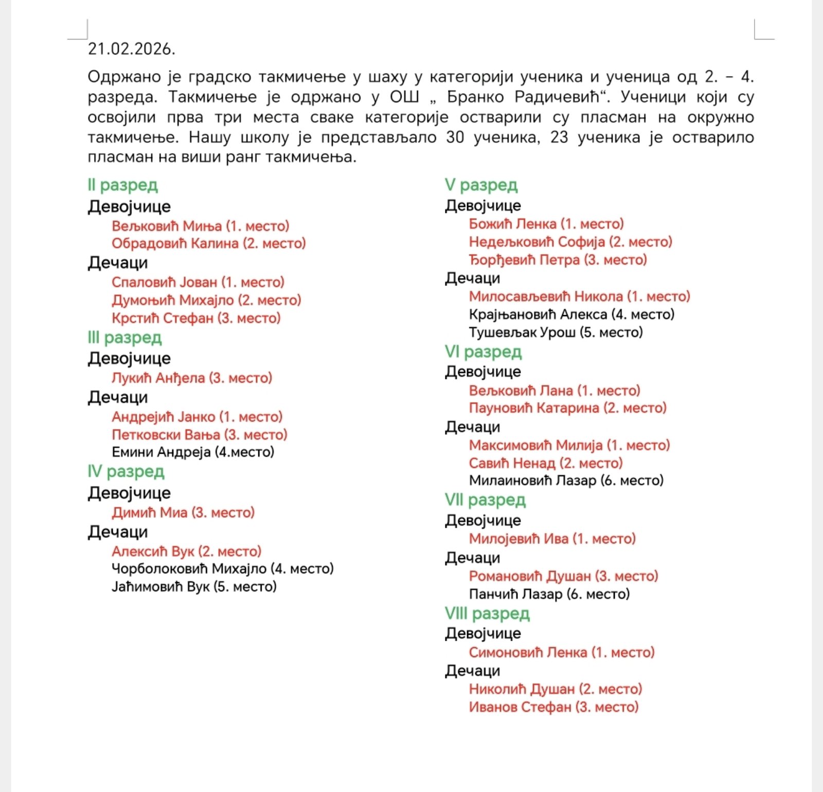 Одржано je градско такмичење у шаху у категорији ученика и ученица од 2. – 4. разреда. Такмичење је одржано у ОШ „ Бранко Радичевић“. Ученици који су освојили прва три места сваке категорије остварили су пласман на окружно такмичење. Нашу школу је представљало 30 ученика, 23 ученика је остварило пласман на виши ранг такмичења.