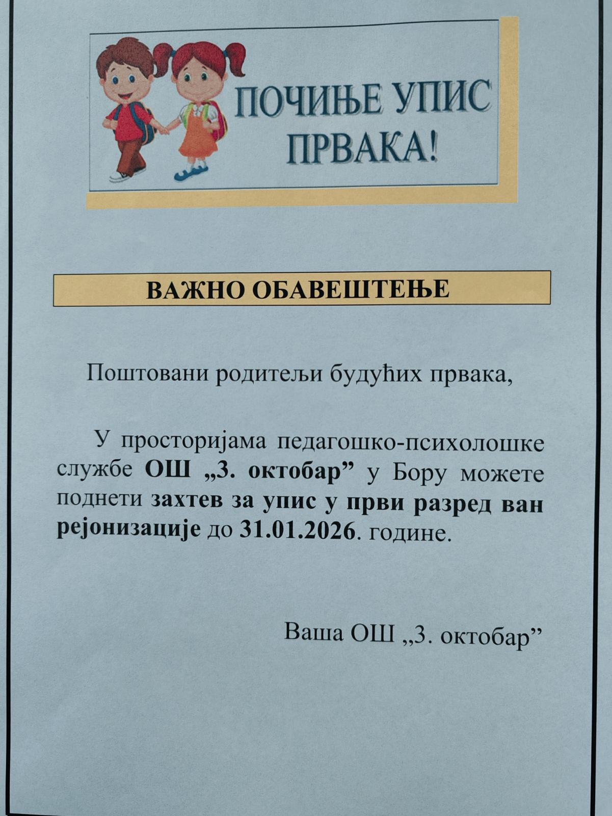Упис првака ван рејонизацијеДатум: 12. Januar 2026 08:06 Категорија: Новости